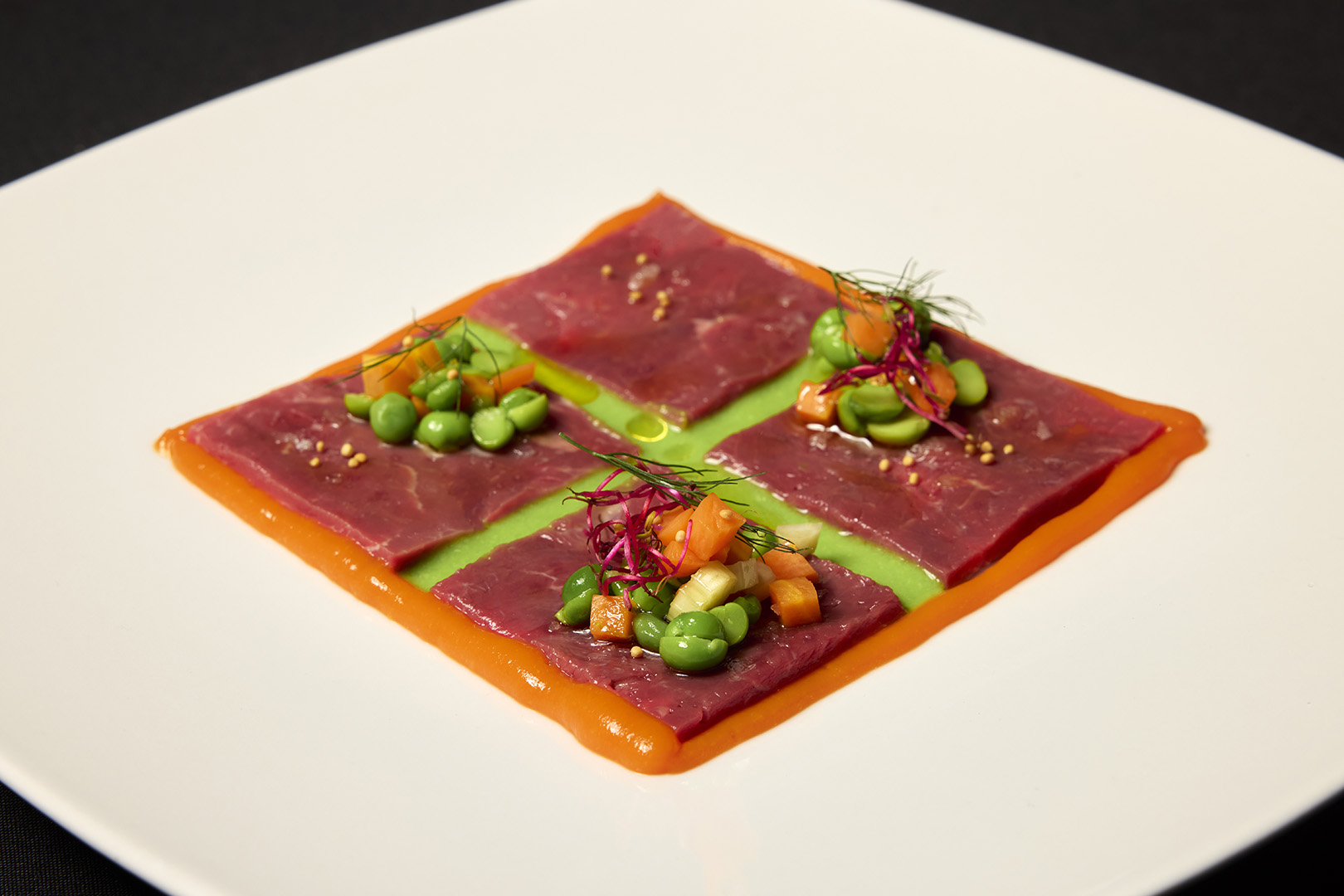 Sbollentare i pisellini per pochi minuti in modo da preservarne il colore, raffreddarli in acqua ghiacciata, scolarli e metterli in un bicchiere da immersione, aggiungerci sale e pepe e una nocetta di burro irlandese precedentemente sciolto a bagnomaria, olio evo e un pò d’acqua per dare la consistenza alla crema desiderata, emulsionare con frullatore ad immersione, e passare su colino per vellutare la crema togliendo eventuali tracce di bucce dei piselli.